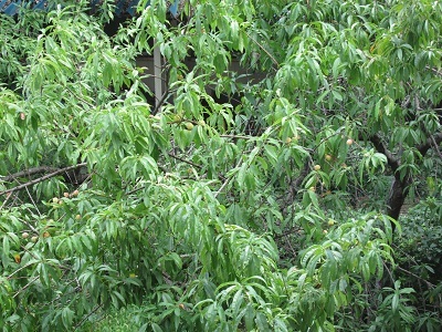 学校の桃の木は、只今、実をたくさんつけています。そして少しずつ色づいてきました。