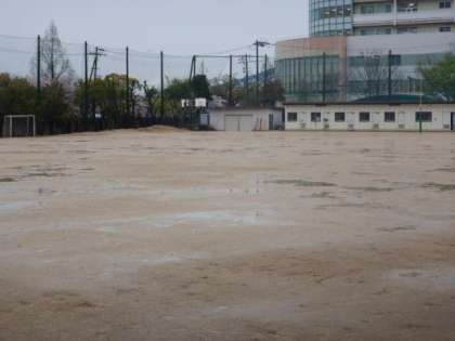 雨も風も冷たく、せっかく乾き始めたグランドも水たまりに
