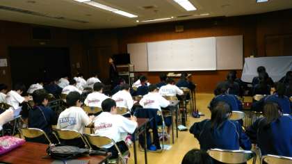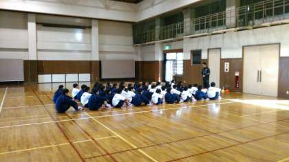 1組は体育館で集団行動、2組は中研修室で学校生活について、3組は大研修室で授業の受け方について、どれも4月当初に学習したことを再確認する学習です。