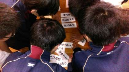 細切れになった文章を並び替えて、元の文章を完成させます。みんな苦労していますが、とても楽しそうです。