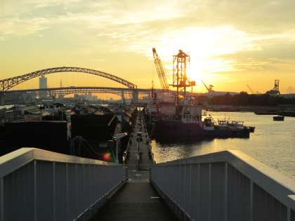 夕陽と言えば、はしけ桟橋。光り輝く、サンセットです。