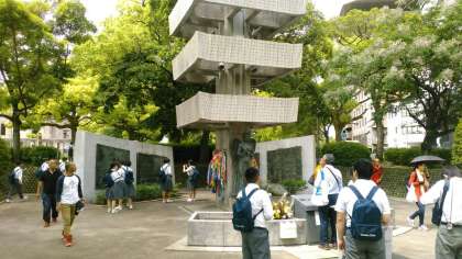原爆ドームの近くにある動員学徒慰霊塔です。ピースウォークで生徒たちも訪れましたが、広島の原爆で中学生以上の動員学徒が約6300人犠牲となりました。動員されずに学校で勉強できることの幸せを感じてほしいです。