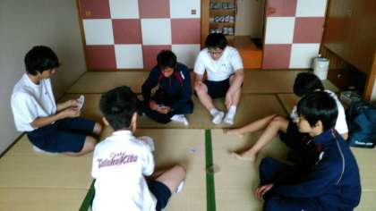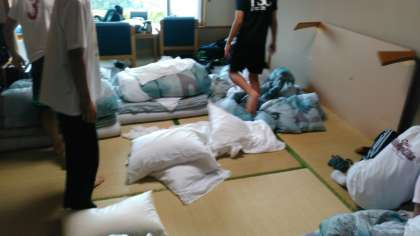 起床です。午前のラフティングの準備も含め、退館の準備です。早いところは、すべての準備を整えて余裕でトランプをしています。