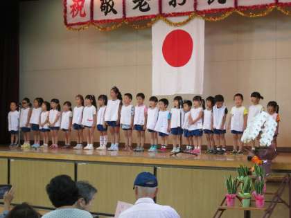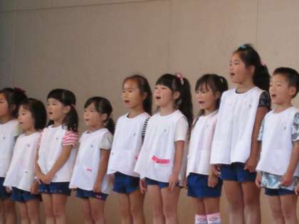 最初は、泉尾幼稚園の園児による唱歌と園歌の披露でした。園長先生が自ら伴奏し、園児たちは小さいながらに大きく口を開けて、元気よく歌っていました。