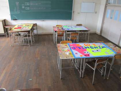 デザイン画から拡大して下書きし、ポスターカラーで色塗りを。