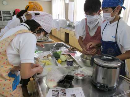 手を洗って、野菜を洗って、皮をむいて、包丁さばきです。
