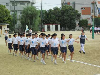 クラスがまとまって、腕を振り、足をしっかり合わせて、行進します。