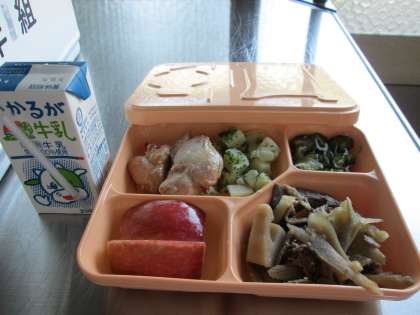 本日の給食は、鶏肉・ジャガイモ・リンゴなど、ご覧のとおりです。