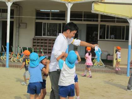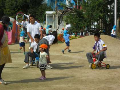 砂場では、園児そっちのけで山やトンネルを作っている生徒もいました。