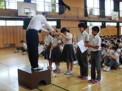 表彰伝達では、先週行われた服装チェック週間における最優秀賞の学級への表彰がありました。