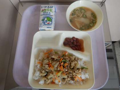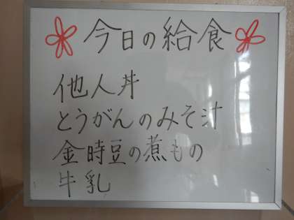 みなさんご存じのように、鶏肉を鶏卵でとじた丼は、親と子に見立てて「親子丼」と呼んでいるのに対して、鶏肉以外の肉(今日の給食では牛肉)を鶏卵でとじたものを「他人丼」と呼んでいます。しかしながらこの「他人丼」という名称は関東地方ではあまり使われていないそうです。