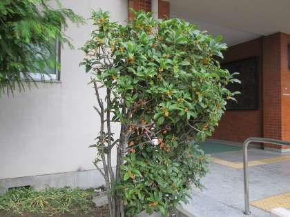 玄関横の金木犀(キンモクセイ)がオレンジ色の花びらをたくさんつけ、