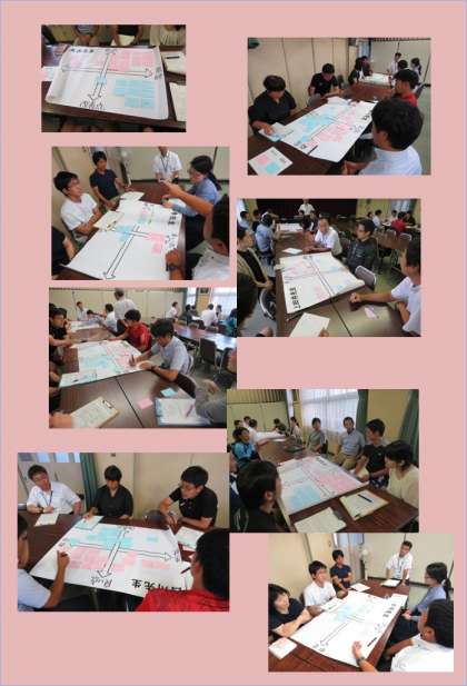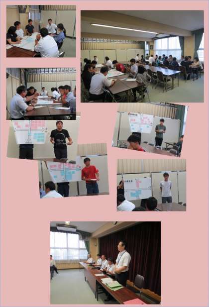 研究授業終了後、多目的室にて研究協議会を行いました。授業者からの感想のあと、各授業ごとに分かれて授業内容について協議が行われ、その協議内容について発表しました。