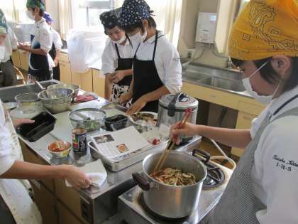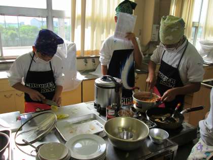 班単位でみんなが協力。先生の指導のもと、和気あいあいの中、しだいに料理が完成されていきました。