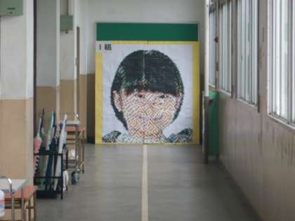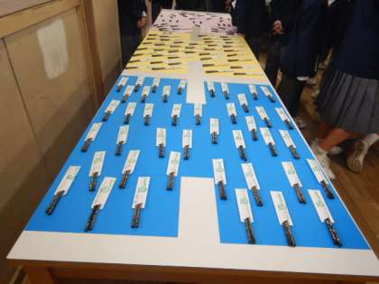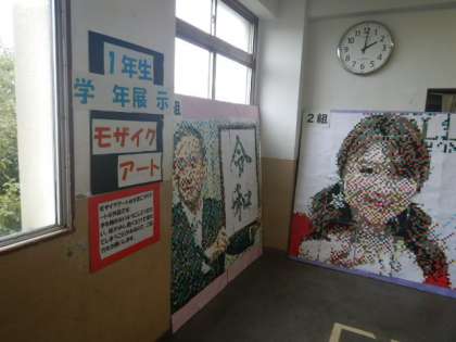 各学級で制作した「今、旬な人」のモザイクアートと宿泊オリエンテーションでつくった「マイ箸」です。モザイクアートはもちろん誰だかわかりますよね。