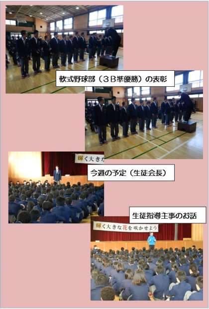 生徒会長からは今週の予定の連絡、生徒指導主事の先生からは制服ブレザーの下のセーターやベストについての諸注意がありました。