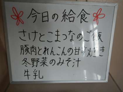 今日の献立の中には冬野菜が、「小松菜」「レンコン」「白菜」「ごぼう」「にんじん」「青ネギ」の6種類も入っています。