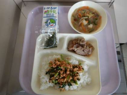 今日の献立は、学校給食献立コンクールで優秀賞を受賞した作品です。献立の考案者は、福島区の野田小学校の昨年の6年生です。『野菜をいっぱい使って、5,6時間目も勉強が、がんばれるような給食』だそうです。