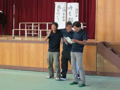 3年教員のサプライズです! 1人の先生がマイクを片手に歌いだし、若手御三家が肩を組んで「若者たち」を!