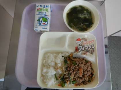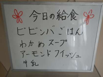 ビビンバは韓国料理の中でも最もグローバル化した料理です。丼や専用容器にご飯とナムル(もやしなどの野菜やゼンマイなどの山菜、野草を塩ゆでしたものを調味料とゴマ油で和えたもの)や肉、卵等の具を入れ良くかき混ぜて食べる料理で、コチュジャンやごま油等の調味料をかけ、よく混ぜてから食べます。給食では卵は使っていません。