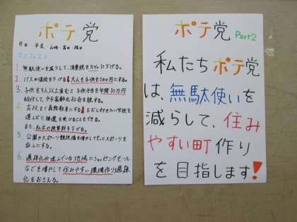 公民の授業でチャレンジしたグループ学習の「マニフェスト」。