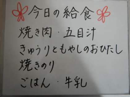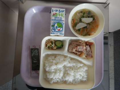 今日の五目汁には、鶏肉、にんじん、だいこん、はくさい、えのきたけ、かまぼこ、みつばが入っています。