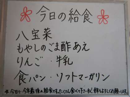 今日は今年最後の給食です。みんな残さずにしっかり食べよう。