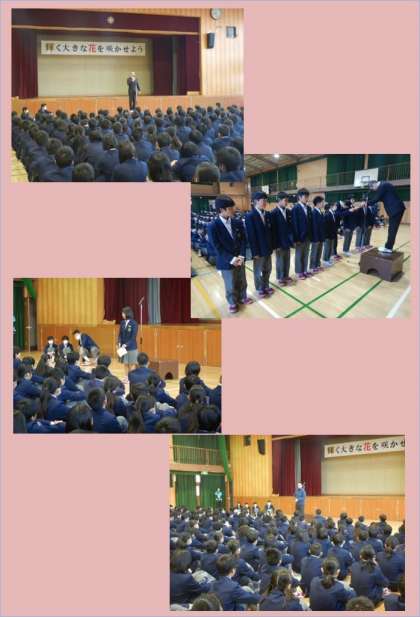 引き続き、バレーボール部へ岡田カップ準優勝の表彰があり、生徒会役員からはユニセフの募金と書き損じはがきの回収の依頼がありました。