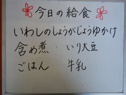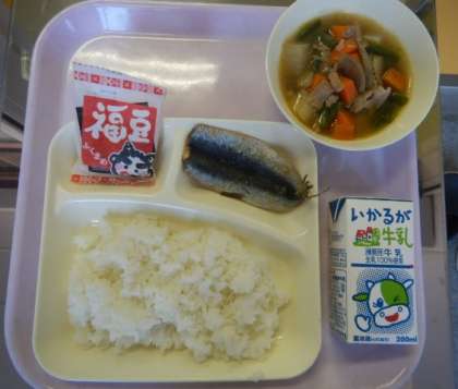 本日の献立は「節分の行事献立」です。節分に豆をまくことについては「魔滅(まめ)」に通じ、無病息災を祈る意味があります。昔、京都の鞍馬に鬼が出たとき、毘沙門天のお告げによって大豆を鬼の目に投げつけたところ、鬼を退治できたという話が残っており、「魔の目(魔目=まめ)」に豆を投げつけて「魔を滅する(魔滅=まめ)」に通じるということです。