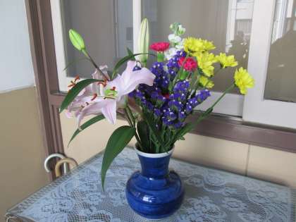 ユリのいい匂いとともに、青紫の可憐な花が輝いています。