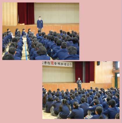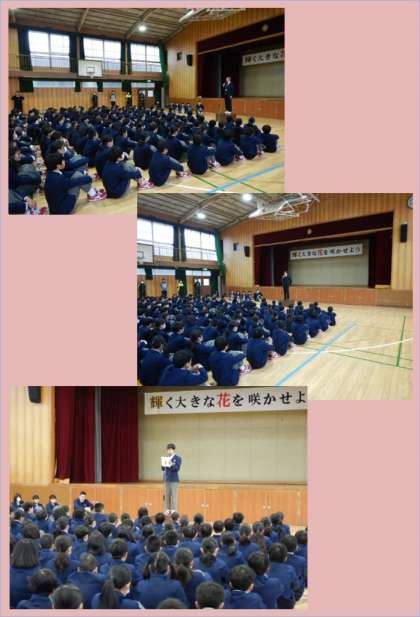 本日は3年生のほとんどの生徒が私立高校受験のため不在です。そのため朝の全校集会は1,2年生のみで行いました。