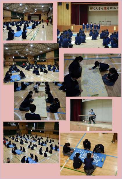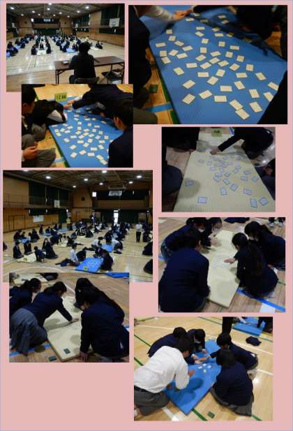 12日(水)5,6時限目に体育館において1年生は百人一首大会を行いました。学年の先生たちが順に読み手となり、2時間たっぷり百人一首の世界に包まれました。