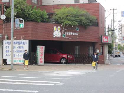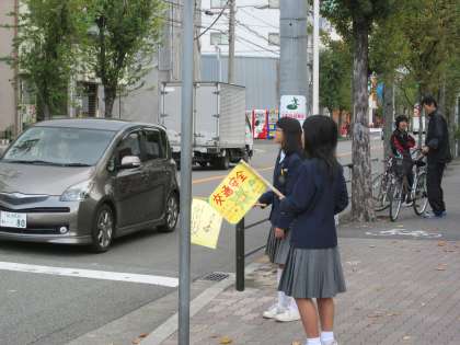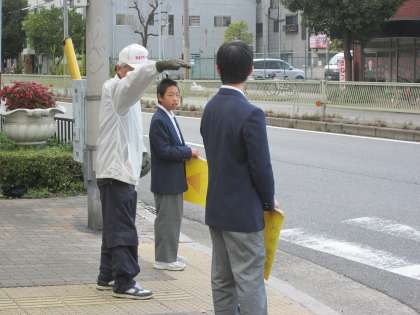 手作りの交通安全の黄色の旗を持って、あいさつと安全を見守ります。