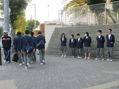 朝のあいさつ運動も、一味変えて、正門から外へ出てのあいさつに。