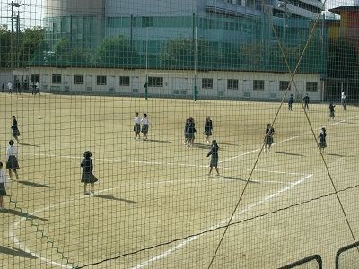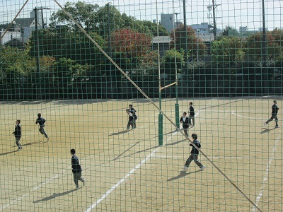 生徒たちが大勢グランドに出て、遊んでいます。