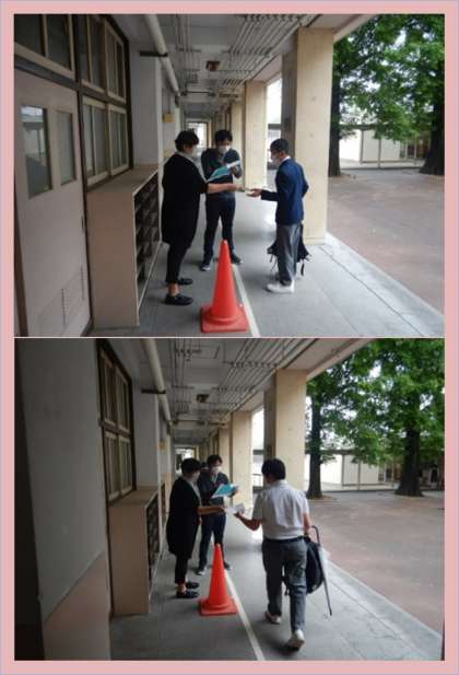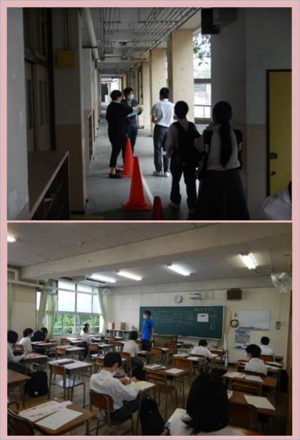 本日19日(火)、2年生の登校日です。分割登校の1グループ目の登校時にはまだ小雨が降っていました。健康観察表で体温などのチェックを済ませた生徒たちは教室へ入室します。今日は学級担任による学級活動を行っています。