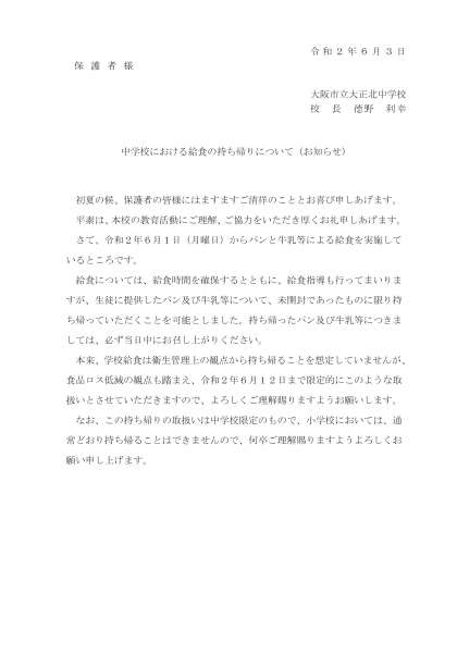 大阪市教育委員会から通知があり、現在提供しているパンと牛乳について未開封のものに限り持ち帰ることが可能となりました。6月12日までの限定的な取り扱いですが、明日より実施いたします。なお、持ち帰ったパンと牛乳については、必ず当日中にお召し上がりください。また、これに伴う給食時間の変更はありません。