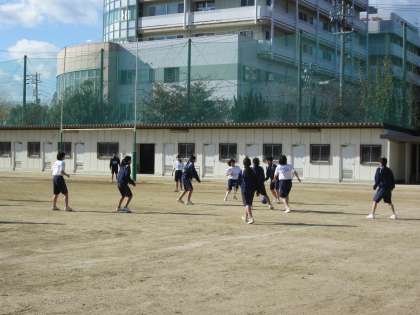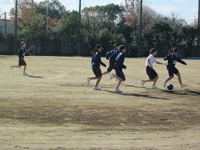 女子はグランドでサッカーの授業。