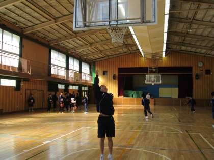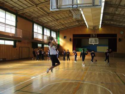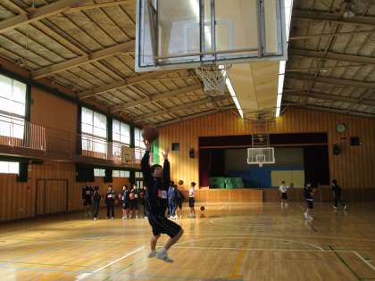 ドリブルからワン・ツーステップで、腕をしっかりとあげて伸び上がる!