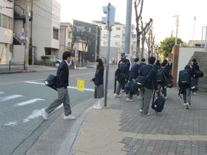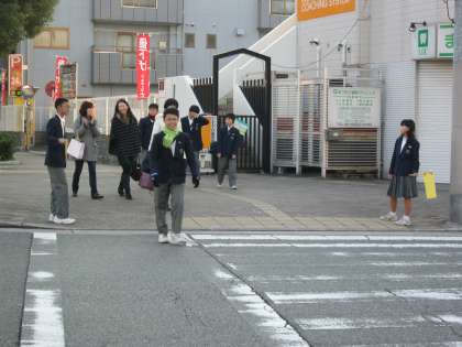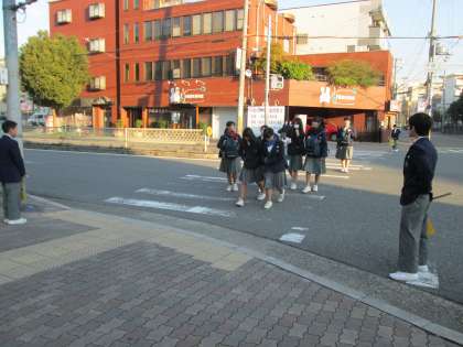 朝8時過ぎから、生徒会の役員は横断歩道で交通安全、そして学級代表は正門であいさつ運動に取り組んでくれています。