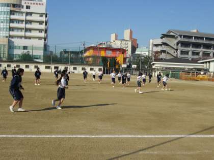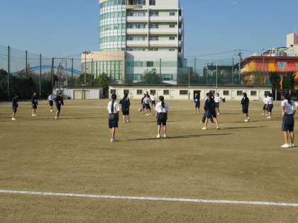 グランドでは、2年生の女子が、サッカーの授業に取り組んでいます。