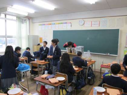 1年の教室では、ルーを求めて、長蛇の列! 担任の先生も分量配分に苦労します。