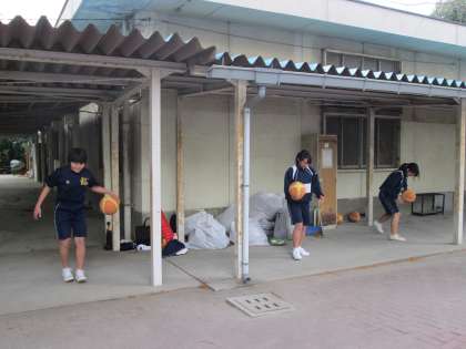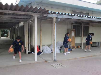 中庭では、女子バスケットボール部がハンドリングやドリブルの練習を行っています。