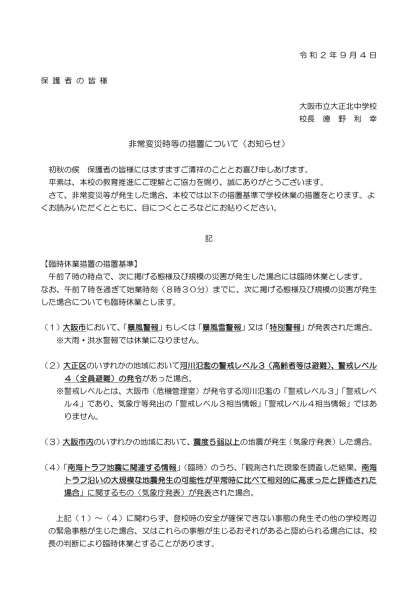 本日、「非常変災時の措置について(お知らせ)」のプリントを配布しております。内容をご確認いただき、目につくところなどにお貼りいただきますようお願いします。