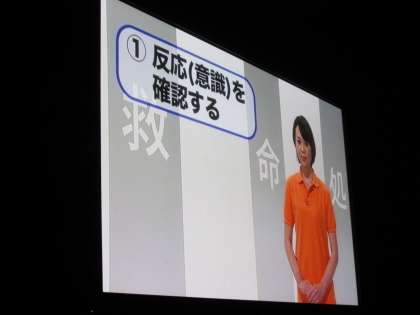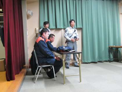DVDで講習を受けた後、実際に、傷病者を発見した場合に、心肺蘇生の中心となる心臓マッサージと人工呼吸を訓練しました。