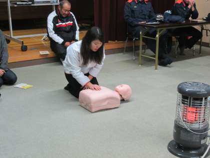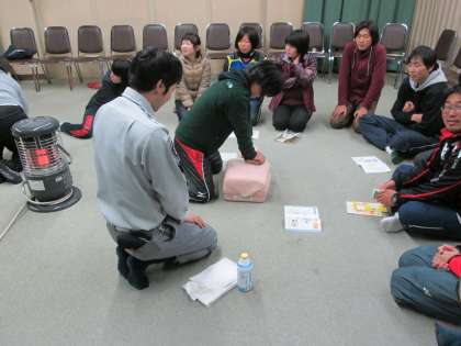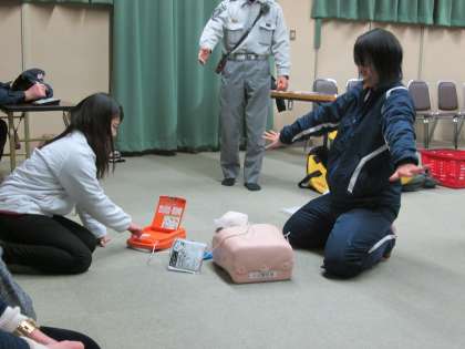 前半は、胸骨圧迫の心臓マッサージと人工呼吸を。後半は、AEDを使って、一連の方法を確認しました。