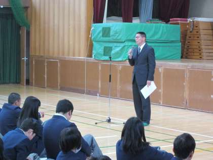 それでは、3学期、健康で元気に迎えられるよう、交通事故や犯罪に巻き込まれないように、またインフルエンザなど病気にはくれぐれも気をつけてください。そして、軽率な行動や人に迷惑をかけること、タバコやアルコール、万引きやバイクの運転など犯罪行為には絶対に手を出さないようお願いします。