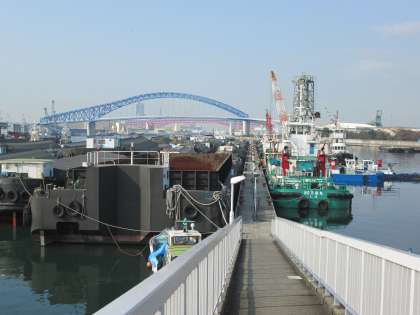 昼間のはしけ桟橋。ブルーの千歳橋と赤のなみはや大橋をバックに、色とりどりの船舶が停泊しています。