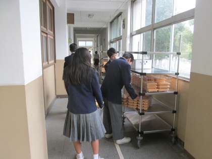 4限後、1年生の生徒たちが給食を受け取りに来ました。