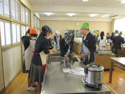 全員エプロン姿に変身。手をきれいに洗って調理開始です。